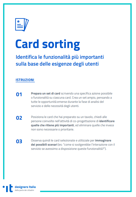 Sul sito di Designers Italia è disponibile un kit dedicato all’organizzazione dei contenuti tramite il [card sorting](https://prossima.designers.italia.it/risorse-per-progettare/progettare/architettura-dell-informazione/organizza-i-contenuti/).