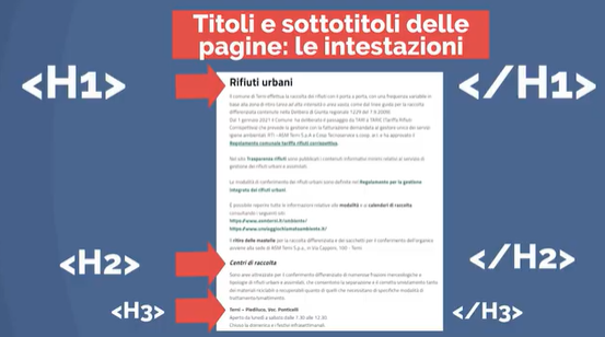 Ciò che i nostri occhi distinguono in titoli, sottotitoli, titoli di paragrafi e sottoparagrafi, per i motori di ricerca sono i “tag di intestazione” e vanno dal livello H1 al livello H6”. Servono a strutturare il contenuto in sezioni distinte e costituiscono un forte segnale di pertinenza per i motori di ricerca, quando contengono le parole chiave, primarie e secondarie in base al livello.