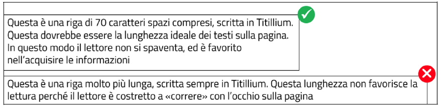 5. la larghezza della colonna di testo deve essere adeguata all’occhio, quindi non troppo larga, perché gli occhi faticano a mantenersi su una riga lunga. Alcuni studi hanno identificato attorno ai 70 caratteri per riga la dimensione ottimale di una colonna di testo;&#x20;