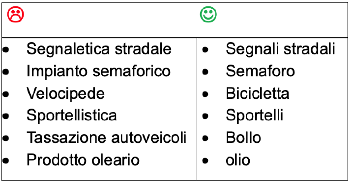 2. usare parole che si riferiscono a cose concrete, ed evitate parole troppo astratte, ad esempio gli iperonimi (parole che si riferiscono ad un oggetto con un sinonimo maggiormente astratto, ad esempio “velocipede” invece di “bicicletta”);