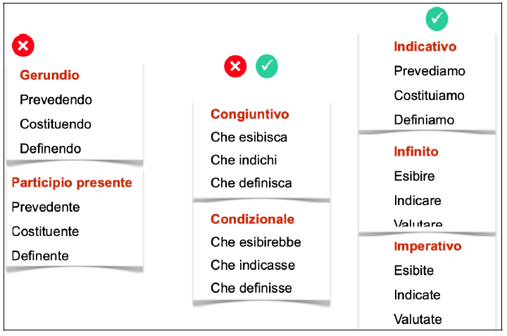 3. usare modi verbali semplici, quali l’indicativo e l’infinito; evitare il gerundio e limitare il congiuntivo;