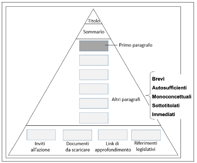 Questa struttura, però, non è efficace per il frettoloso, esigente e poco attento lettore digitale: i contenuti vanno organizzati mettendo all’inizio le cose più importanti, secondo il modello della cosiddetta **piramide invertita**; il resto sono dettagli e approfondimenti. Tale struttura va adottata globalmente nel testo, ma anche nei sottoparagrafi di cui il testo è composto.