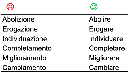 4. preferire sempre i verbi ai sostantivi, ed evitare le cosiddette “nominalizzazioni” (ad esempio “elaborare” e non “procedere all’elaborazione”);