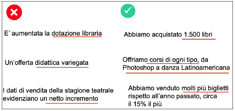 1. Quantità precise. Usare parole che esprimano al meglio le quantità, evitando valutazioni vaghe (ad esempio “notevole”, “accresciuto”);&#x20;
