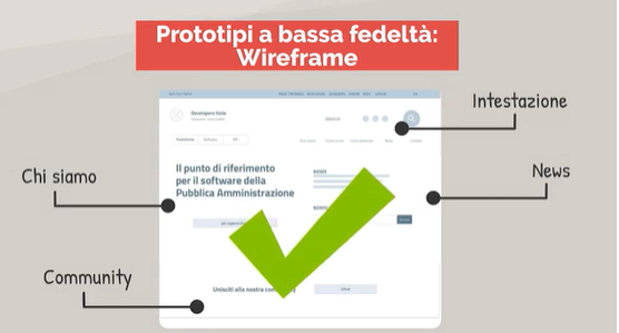 I prototipi a bassa fedeltà, i wireframe, sono una rappresentazione semplificata e approssimativa di un'interfaccia utente e vengono utilizzati nella fase iniziale di progettazione di un prodotto o servizio Gli elementi che li compongono rappresentano solo le varie funzioni dell’interfaccia, in questo modo è possibile verificare rapidamente e a basso costo le caratteristiche di efficienza ed efficacia del servizio digitale.